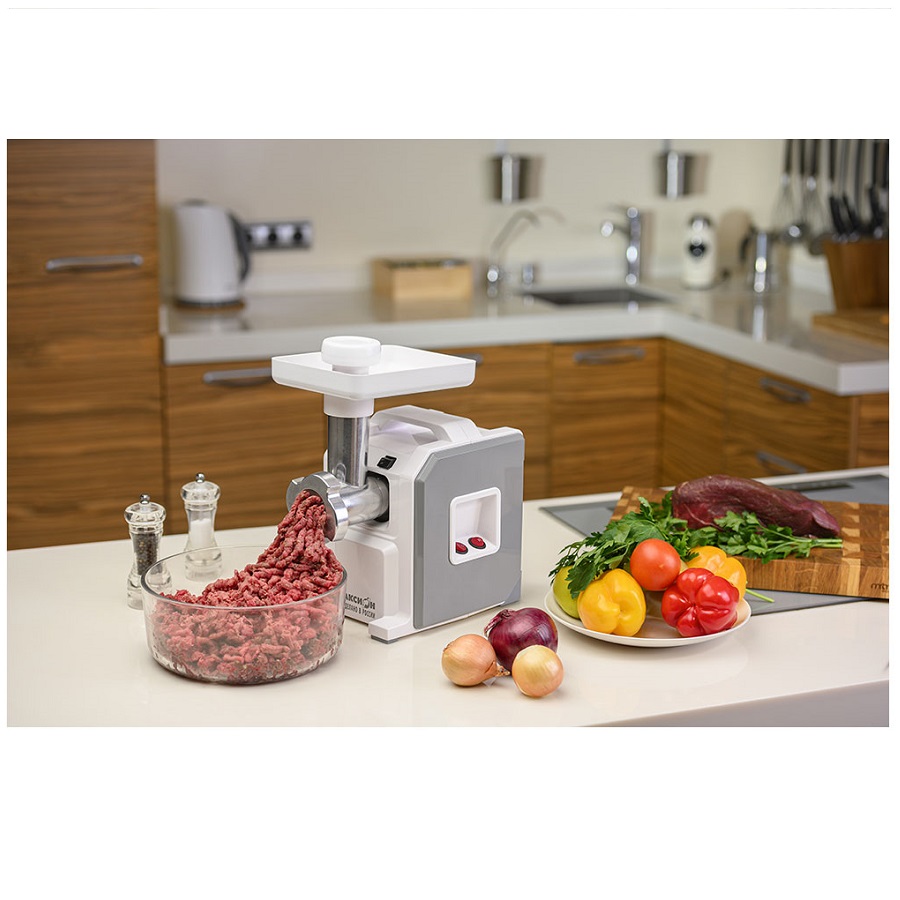 Мощность 1900 Вт,Производительность – до 2 кг фарша в минуту,Двойная защита от перегрузки,Функция «реверс», Время непрерывной работы – 30 минут,Хранение шнура питания и решеток в отсеке с откидной крышкой,Высокое размещение шнековой камеры,
