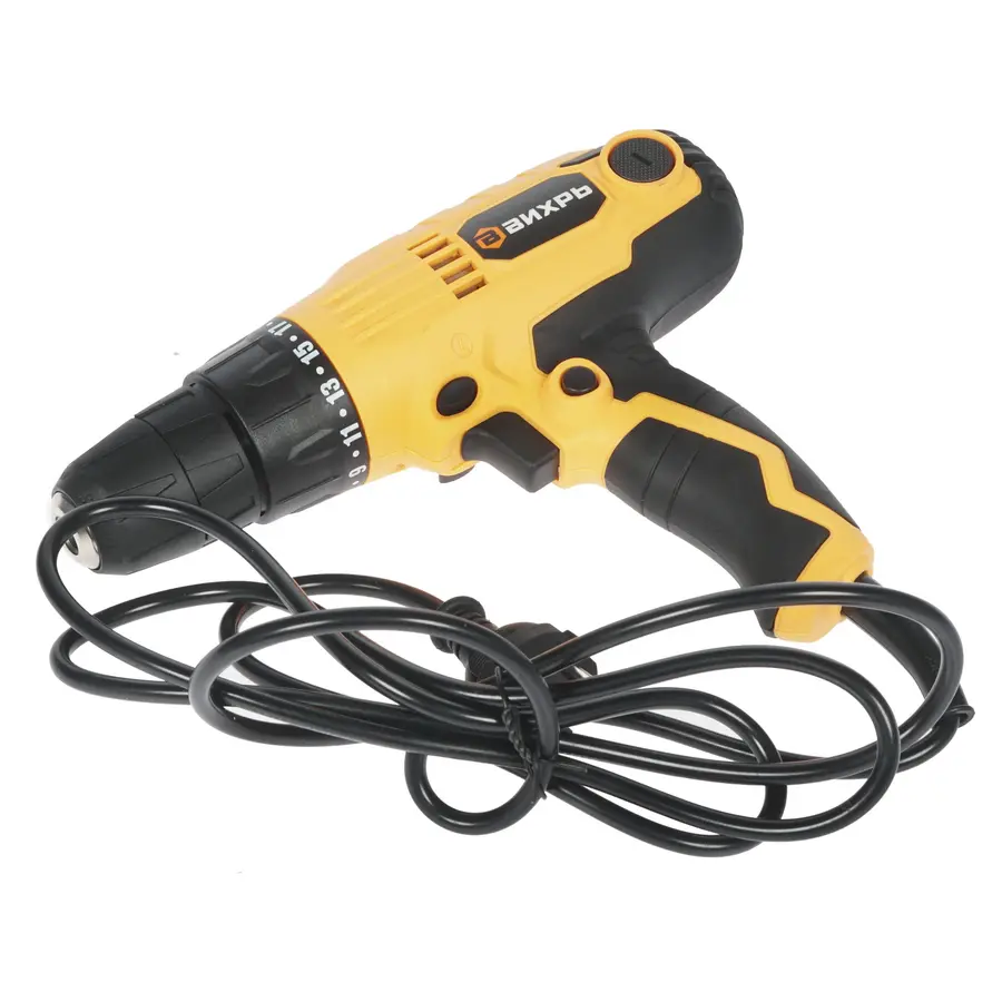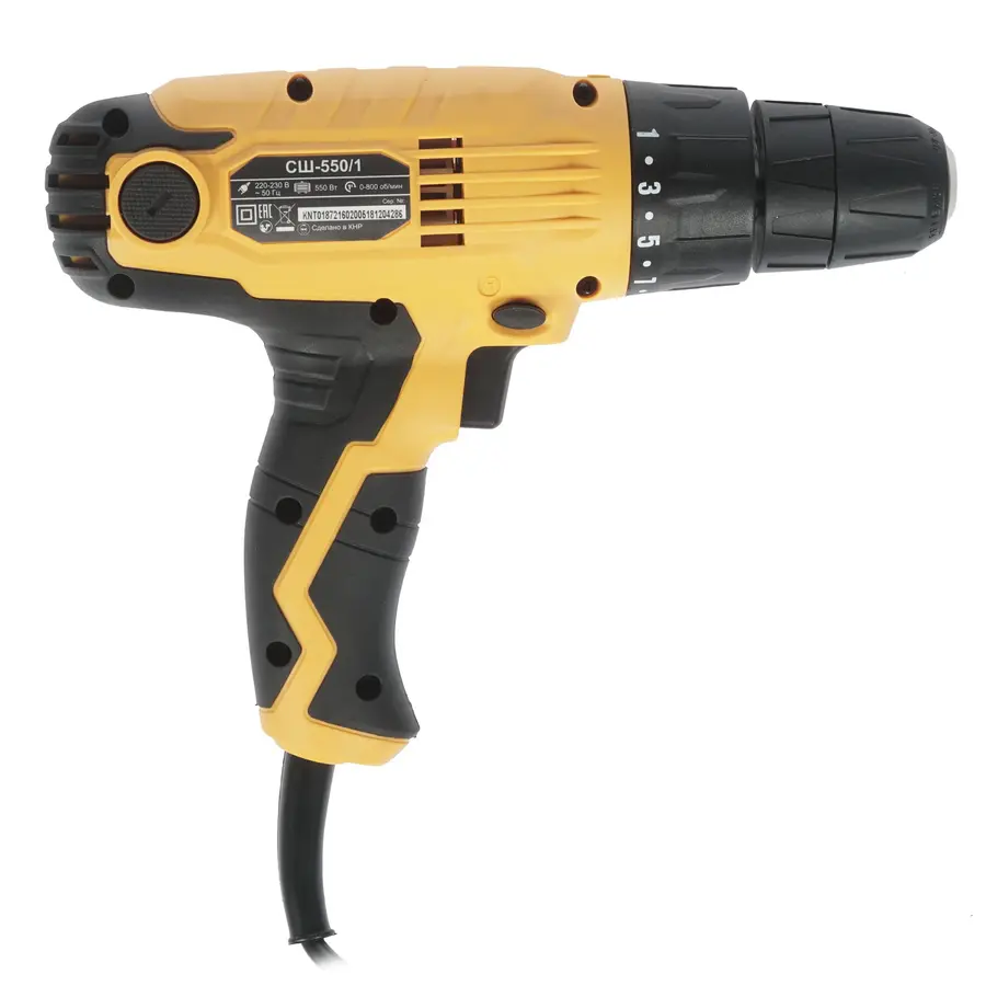 Прибор Вихрь СШ-550/1 дополнен 20-ю ступенями крутящего момента вплоть до 25 Н/м, а также регулятором для выбора глубины закручивания. С помощью этого инструмента вы можете просверлить отверстия в древесине и металле с диаметром 2.5 и 1 см. Дрель весит 1.3 кг и обладает размерами 23x26 см.
