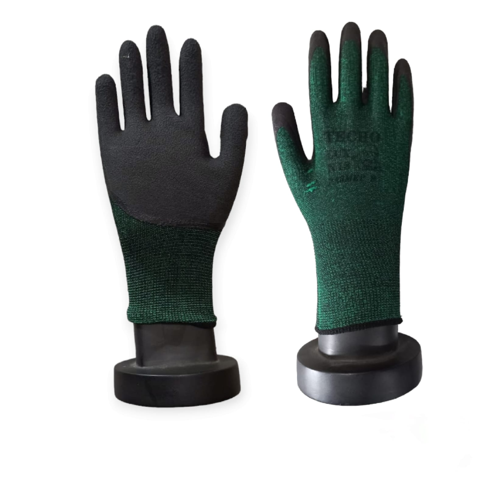 Перчатки нейлоновые с вспенен. латексным покрытием F-22 (полн.облив зел-чёрн) TEXНО 12/600