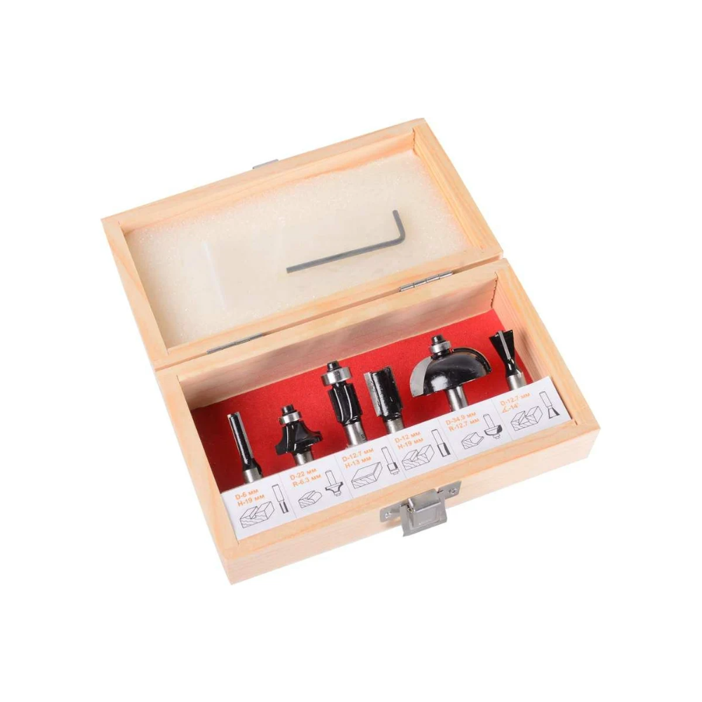 Набор фрез по дереву 6 шт, хвостовик 8 мм, кейс Вихрь 73/10/6/20для работы с фрезерными станками и ручными фрезерами.