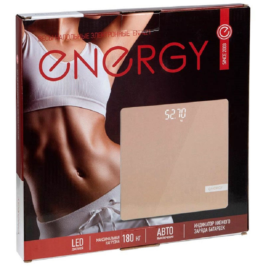 .Напольные электронные весы Energy EN-421 подходят для всей семьи. Стеклянная поверхность прочная, стильная и легко моется. LCD-дисплей отображает четкие показатели веса, температуры помещения, индикаторов и дополнительные данные. Автоматическое включение при взвешивании и автоматическое выключение экономит энергию и обеспечивает удобство использования. Весы также оборудованы индикаторами перегрузки и низкого заряда. Размер платформы — 26х26 см. Максимальная нагрузка — 180 кг.