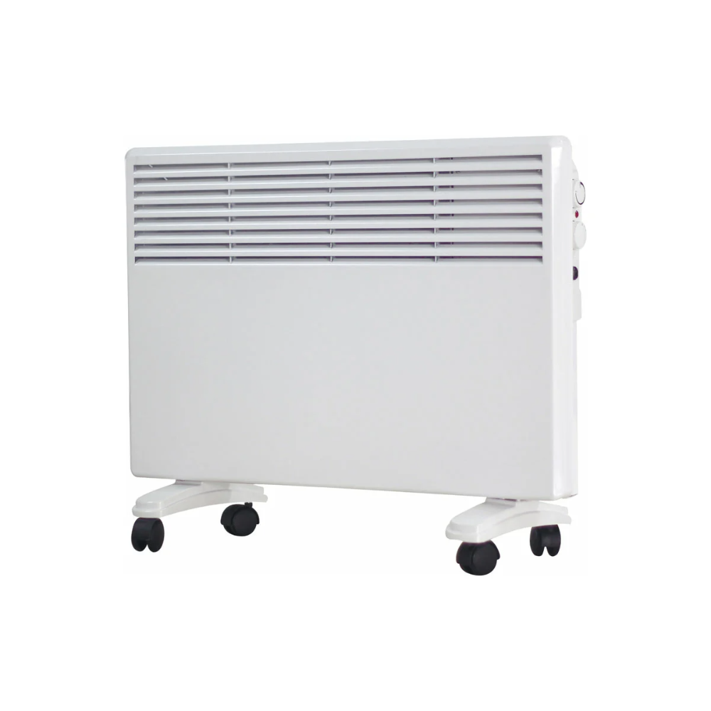 Конвектор обладает небольшими габаритами, имеет современный дизайн и производит нагрев воздуха по принципу конвекции. Повышенную теплоотдачу во время обогрева помещений до 20 м² обеспечивает встроенный нагревательный элемент. Для выбора режима и регулировки температуры используется механическая панель управления с регулируемым термостатом. Обогреватель оборудован светодиодным индикатором, который оповестит вас о функционировании устройства в данный момент. Также имеется встроенная защита от перегрева. В комплекте идут ножки на колёсиках для непринуждённого перемещения. Возможно как напольное, так и настенное размещение.