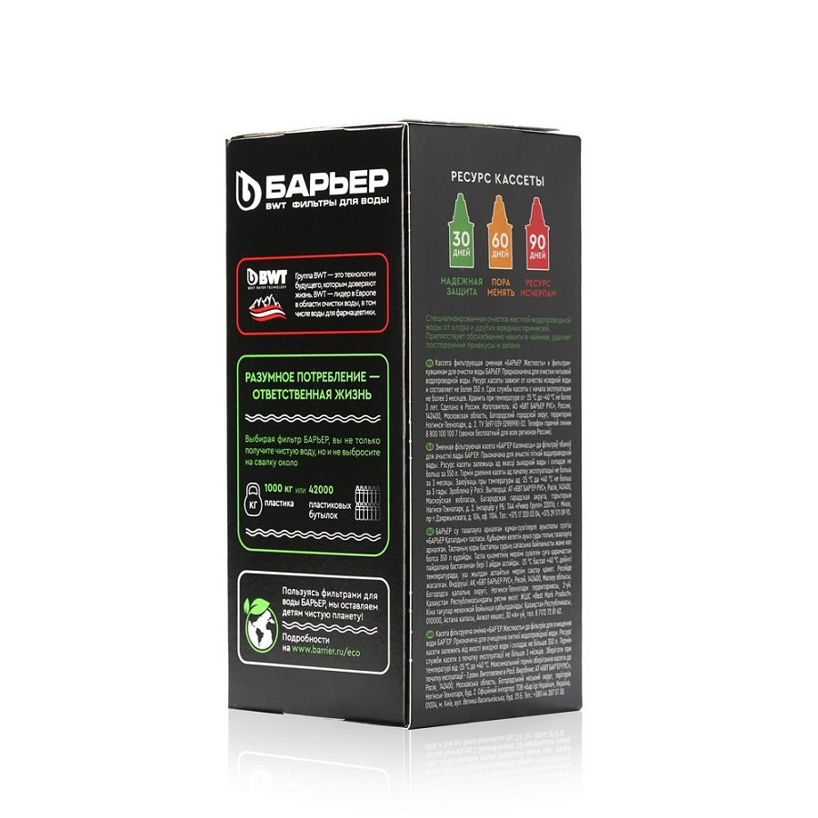 «6 Жесткость» — сменная кассета бренда «БАРЬЕР» серии «Жесткость» для очистки воды с повышенным содержанием солей жёсткости. Уменьшает накипь за счёт удаления солей жёсткости, выпадающих в осадок.Состав кассеты: ионообменная смола, эффективно снижающая содержание ионов кальция и магния в воде. кокосовый активированный уголь обработанный серебром Скорость фильтрации: 300 мл/мин.