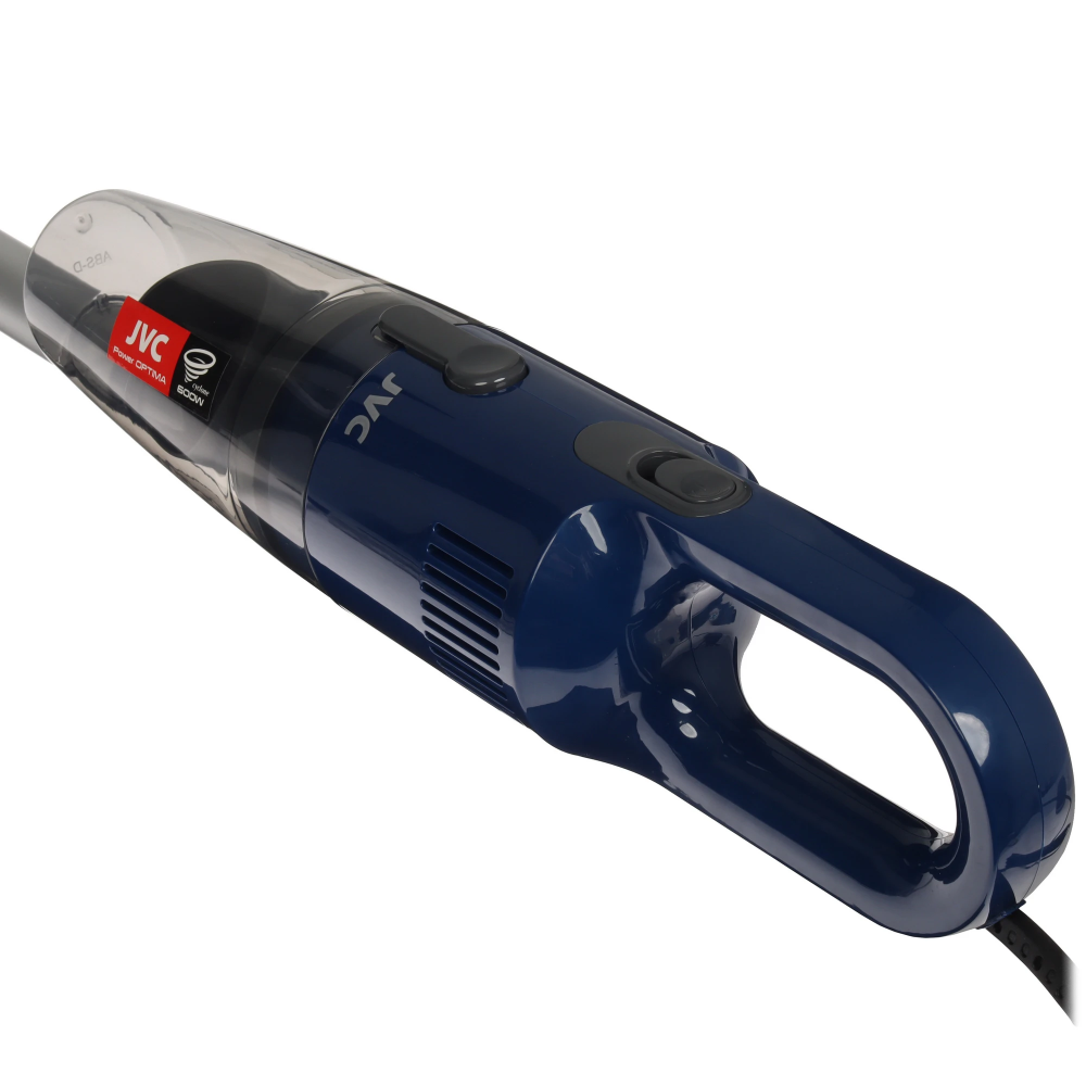 Пылесос вертикальный JVC JH-VS118 синего цвета оснащен сразу двумя приспособлениями для уборки: шваброй для сбора мусора с пола/ковров и ручным отсоединяемым пылесосом для точечной очистки. Циклонная система фильтрации разделяет грязный воздушный поток на пыль и чистый воздух. Здесь для сбора мусора используется многоразовый пластиковый контейнер. Мощность всасывания модели 130 Вт. Устройство справится со сбором крупной пыли, волос, шерсти. В оборудовании также установлен фильтр тонкой очистки. Он задерживает микроскопические частицы.