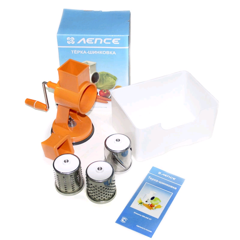 Для измельчения овощей, фруктов, сыра, орехов и других продуктов. Состоит из корпуса, 3-х сменных барабанов, толкателя, ёмкости для измельченных продуктов.