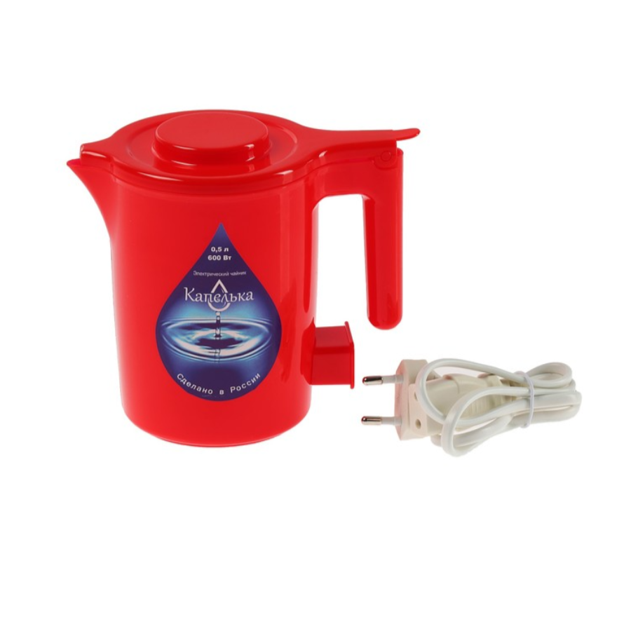 Мощность 600 Вт, открытый нагревательный элемент, синий.Корпус чайника выполнен из пластика и является чрезвычайно легким, что в сочетании с его миниатюрными габаритами (14.6x17 сантиметров) делает использование Капелька красный идеальным в условиях поездки. Также чайник оснащен съемным шнуром и шкалой уровня воды. 0.5 л.Прозрачный корпус чайника.