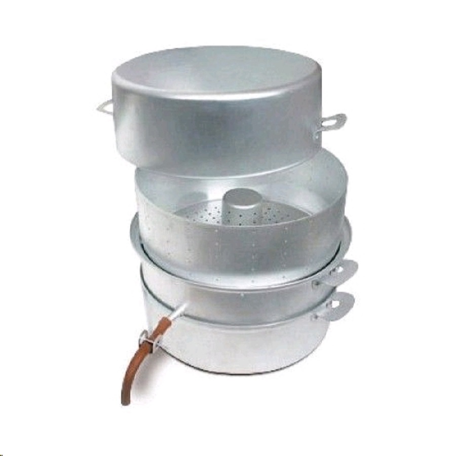 Материал : алюминий,Диаметр: 32 см,Толщина стенки: 1,2 - 1,5 мм Объем: 8 л,Изделие выполнено из пищевого алюминия, по весу не тяжелая, удобная, легко собирается и разбирается. Подходит для всех видов плит, кроме индукционной.