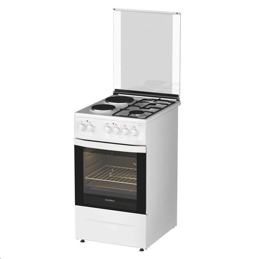 Комбинированная плита DARINA 1D КМ241 337 W выполнена в белом цвете с поворотными ручками управления. Плита оснащена интегрированным электророзжигом горелок стола, подсветкой духовки, выдвижным ящиком для посуды, регулируемыми опорами, фиксированным положением «малое пламя». Размер – 50x60x85. Единовременно потребляемая мощность – 3015 Вт.