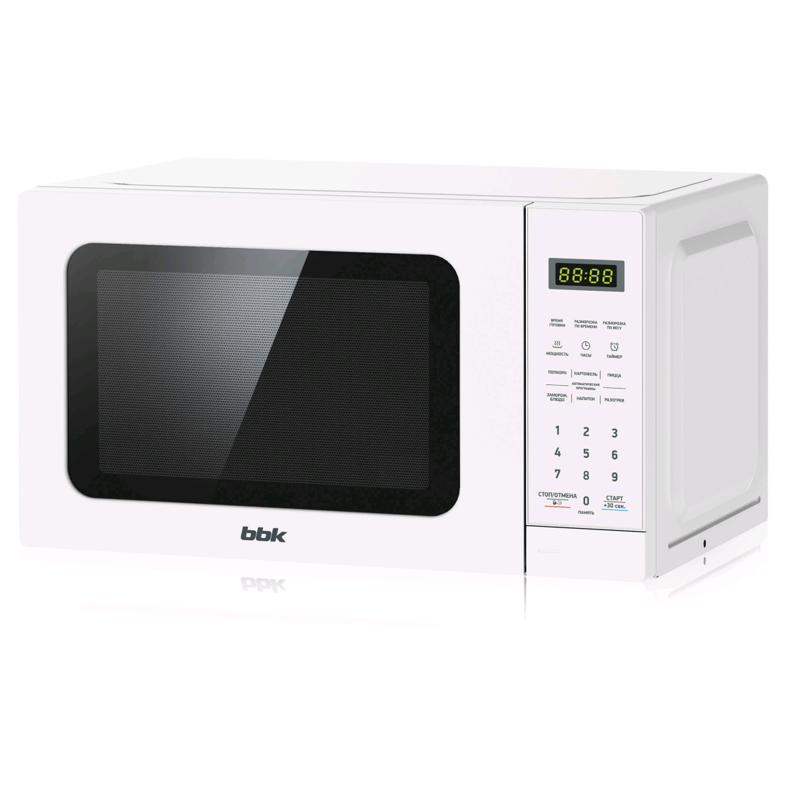 Микроволновая печь BBK 20MWS-767S/W белого цвета обладает объемом 20 л и оснащена поворотным столом. Для управления используются кнопки. В модели реализованы 6 автоматических программ приготовления и таймер на 99 мин. Печь поддерживает 11 уровней мощности.