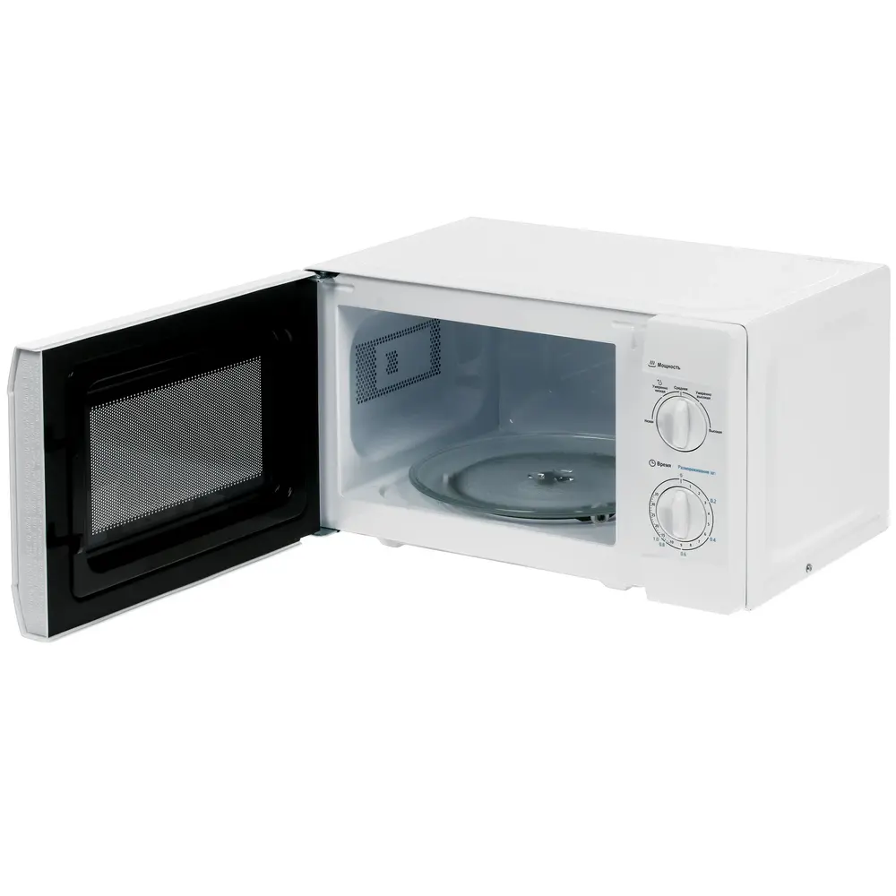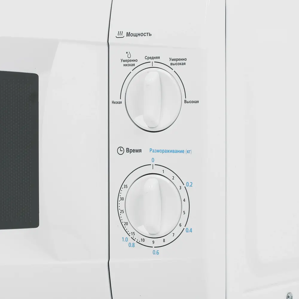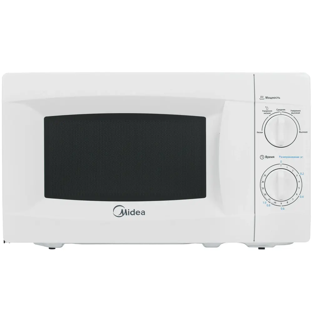 Обладая мощностью 700 Вт, Midea MM720CKE быстро разогревает продукты. Для управления прибором используются поворотные переключатели, расположенные справа от дверцы. Один из них позволяет настроить уровень мощности, а второй ‒ время работы. Таймер рассчитан на 35 минут. Навесная дверца открывается налево. Подсветка камеры поможет наблюдать за процессом разогрева и приготовления пищи.