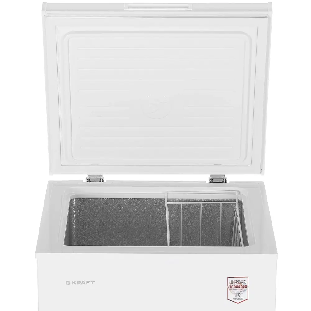 Загрузка продуктов в KRAFT BD (W)-102QX осуществляется сверху, корзина одна. Регулировка температуры производится при помощи поворотного переключателя на передней панели. Есть режим суперзаморозки, позволяющий избежать образования кристаллов льда в продуктах в ходе их подготовки к длительному хранению – так получается сберечь в них максимум витаминов и не повредить структуру.