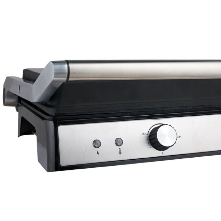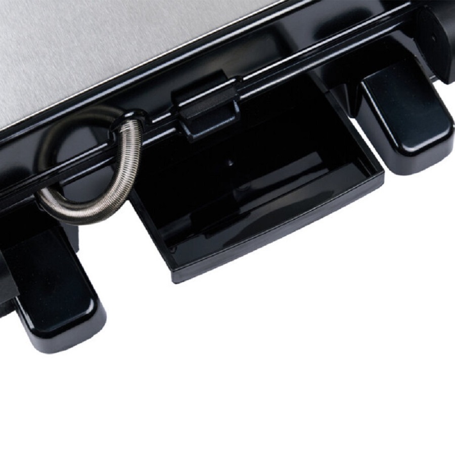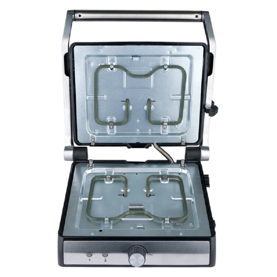 Материал корпуса металл/пластик.Съемные пластины да.Размер рабочей поверхности 280х230 мм.Антипригарное покрытие да.Нагревательный элемент закрытый.Расположение нагревательного элемента сверху и снизу.Открытие на 180°/положение барбекю есть.Регулировка температуры да.Мощность 2000 Вт.Индикатор нагрева да.Лоток для жира и сока да.