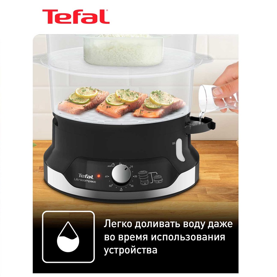 Мощность: 800 Вт. Материал корпуса: пластик. Материал паровых корзин: прозрачный пластик.Функции Таймер до 60 минут с автоматическим отключением. Индикатор уровня воды.Возможность долива воды прямо во время приготовления.