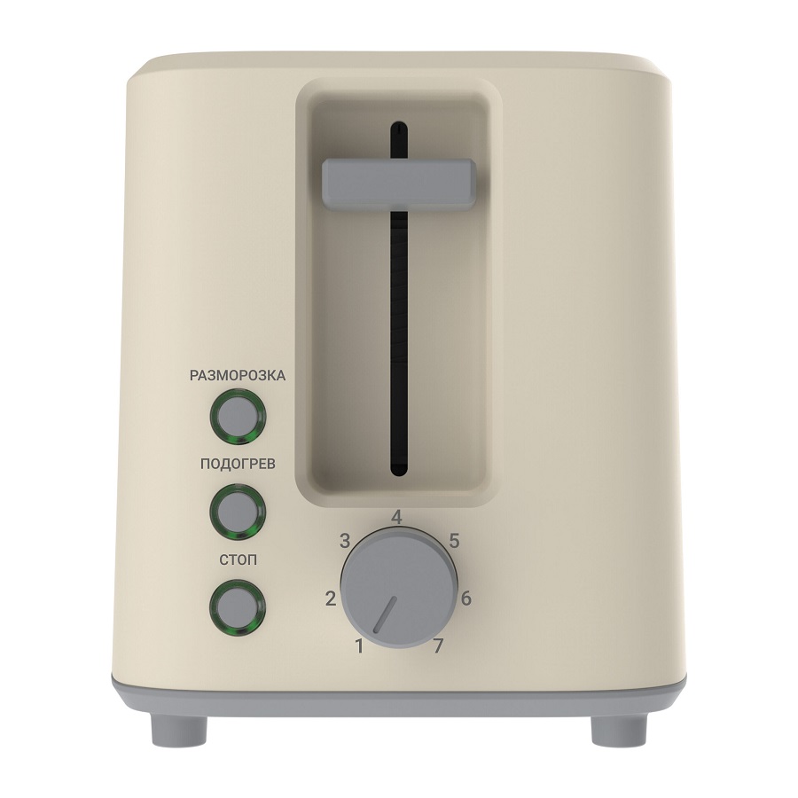 Тостер с функциями разморозки и подогрева. Максимальная мощность: 950Вт. Управление механическое. Количество слотов для хлеба: 2. Размер слота: 130х27мм. Количество степеней прожарки: 7. Кнопка отмены выбранного режима.