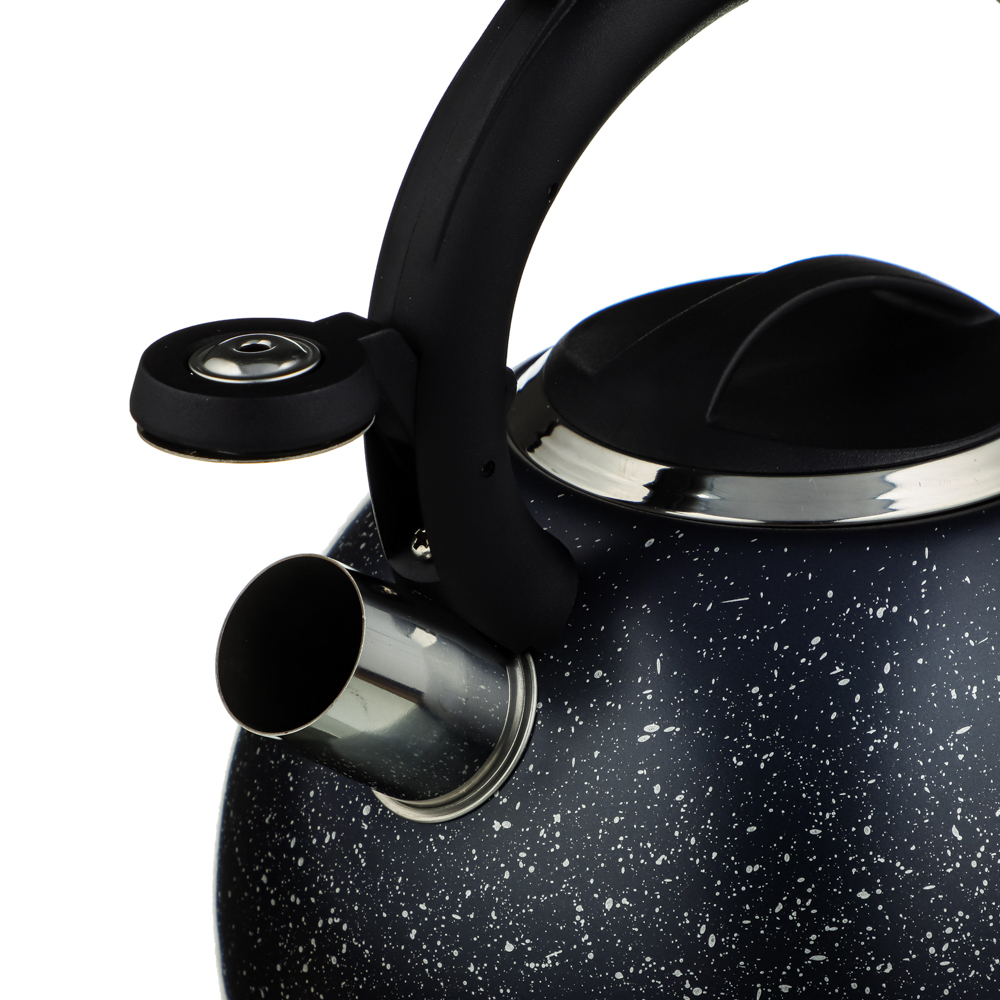 Чайник для плиты VETTA Гаро 847-110 черного цвета изготовлен из нержавеющей стали, которая не подвержена коррозии. Внешнее покрытие корпуса имеет эффект натурального камня. Модель вмещает в себя воду объемом 2.5 л. Свисток на носике модели оповещает о закипании воды. Термоизолированная ручка из бакелита не обжигает руки. VETTA Гаро 847-110 работает на всех видах плит.
