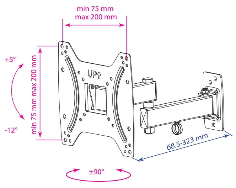 Тип: настенный наклонно-поворотный для LED 15"-42"; VESA: VESA 200x200 мм.; Нагрузка: 25 кг; Дополнительные характеристики: 5 ст св., нак. +5°-15°, пов. ±90°, от ст. 68,5-322 мм.
