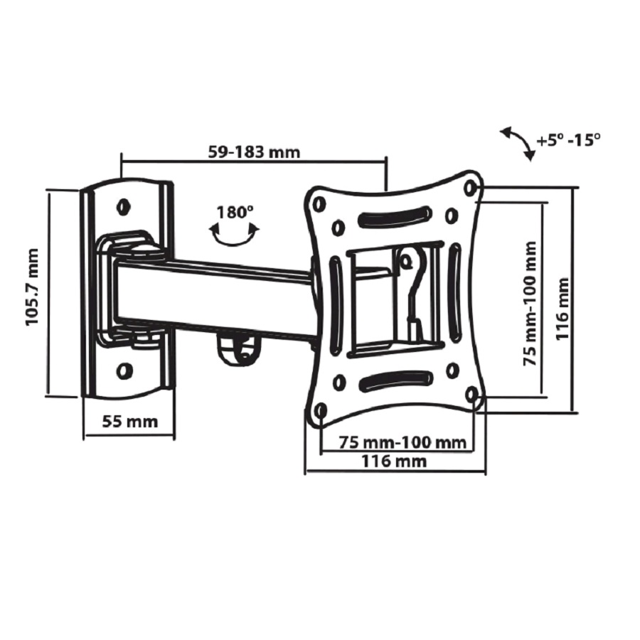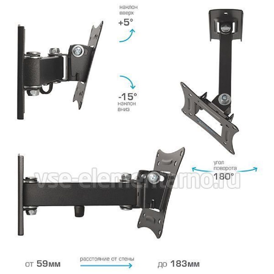 Тип: для TV 10"-32"; VESA: max VESA 100x100 мм; Нагрузка: 15 кг; Дополнительные характеристики: 3 ст св., нак. + 5° -15°, пов. 180°, от ст. 59-183 мм.